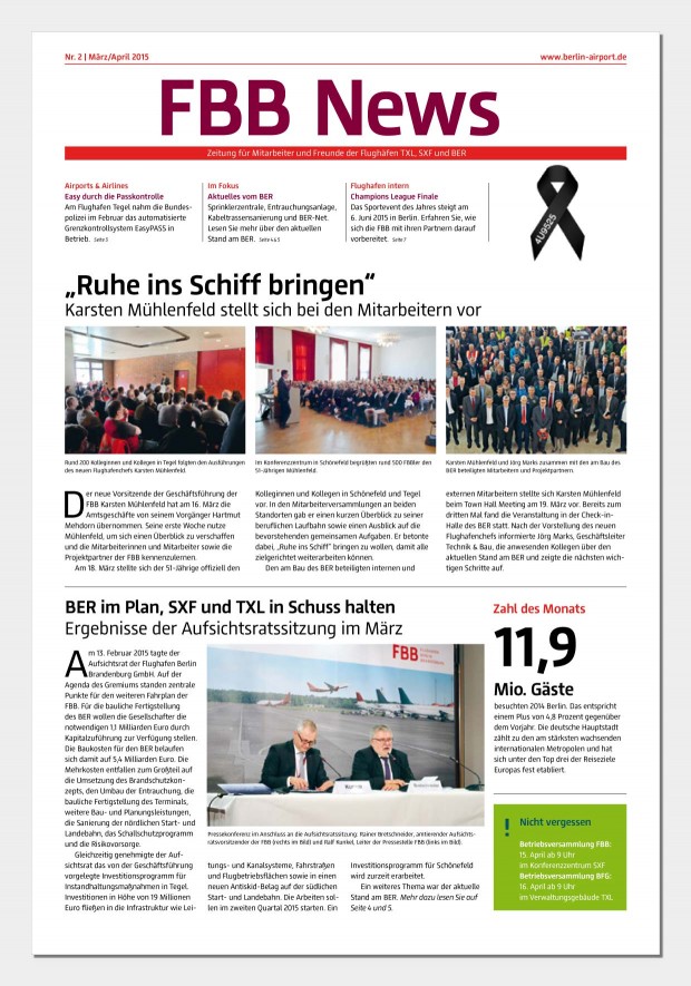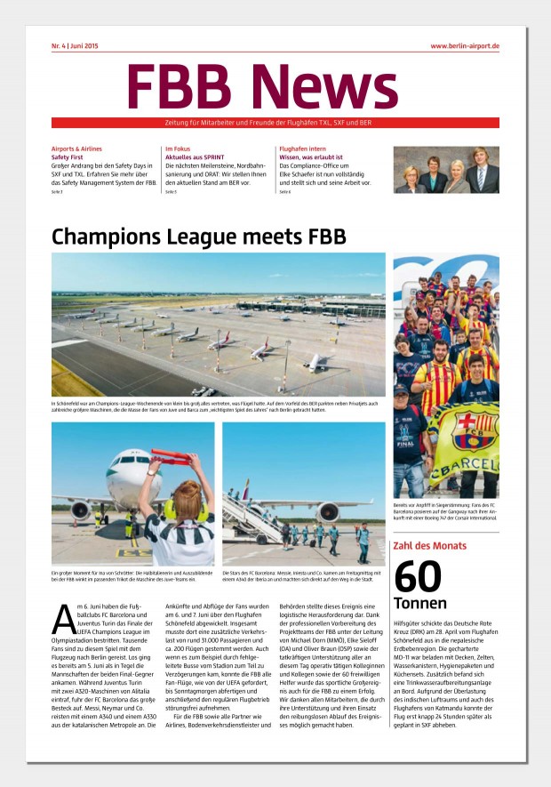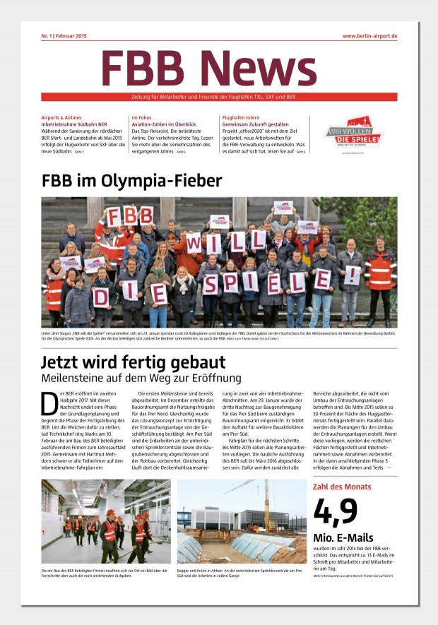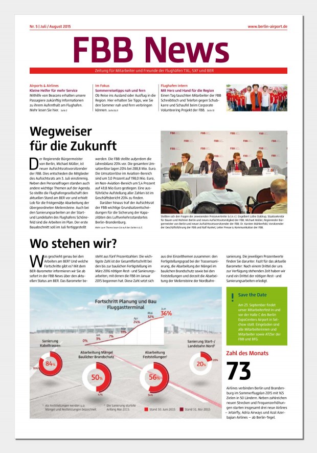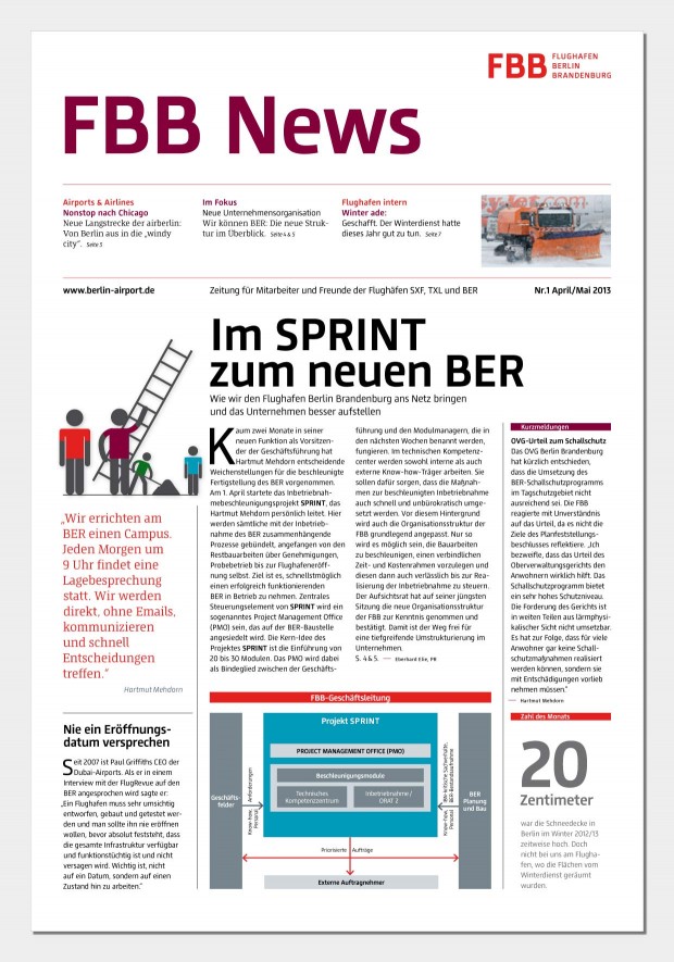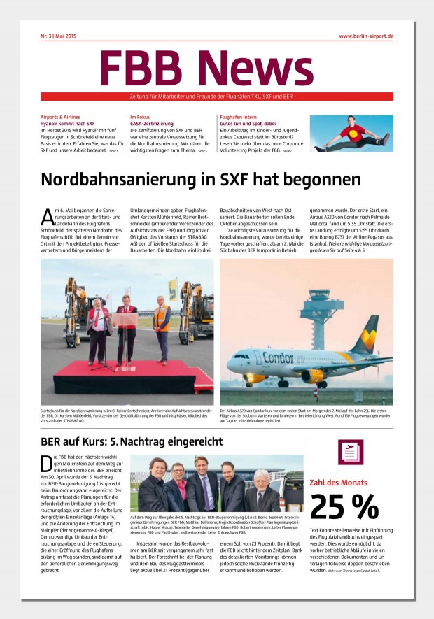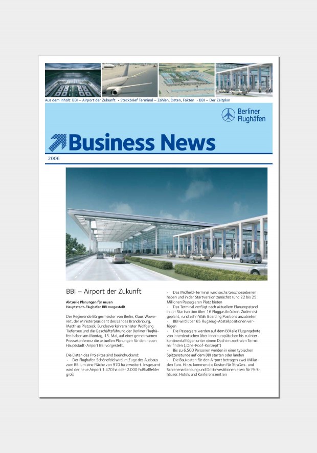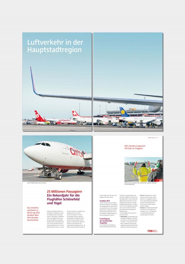 Seit 10 Jahren begleiten wir die Berliner Flughäfen bei der Implementierung und Umsetzung des Corporate Designs. Wir erstellen Geschäftsberichte, das Kundenmagazin, die Mitarbeiterzeitung, Umweltberichte, Lärmschutzberichte und ungezählte weitere Publikationen.