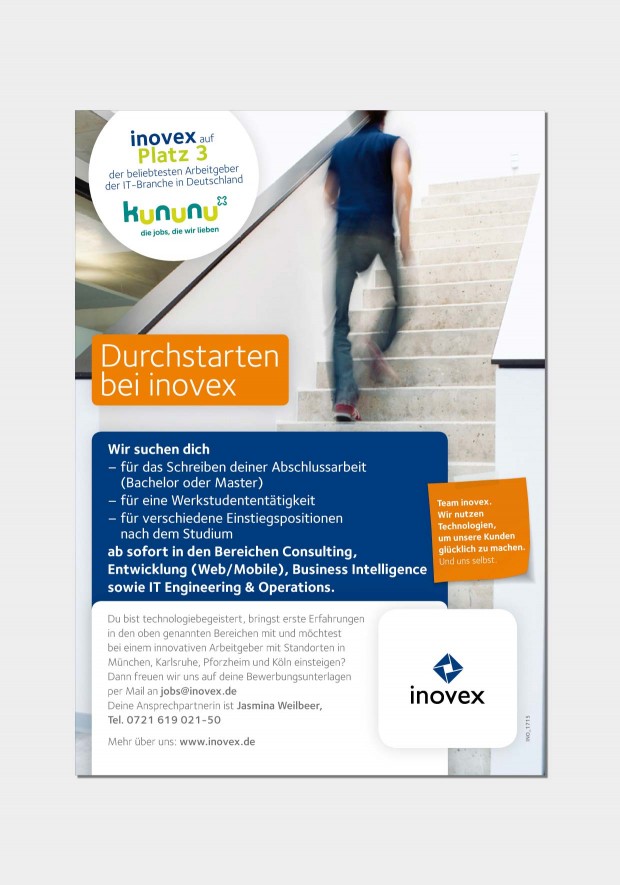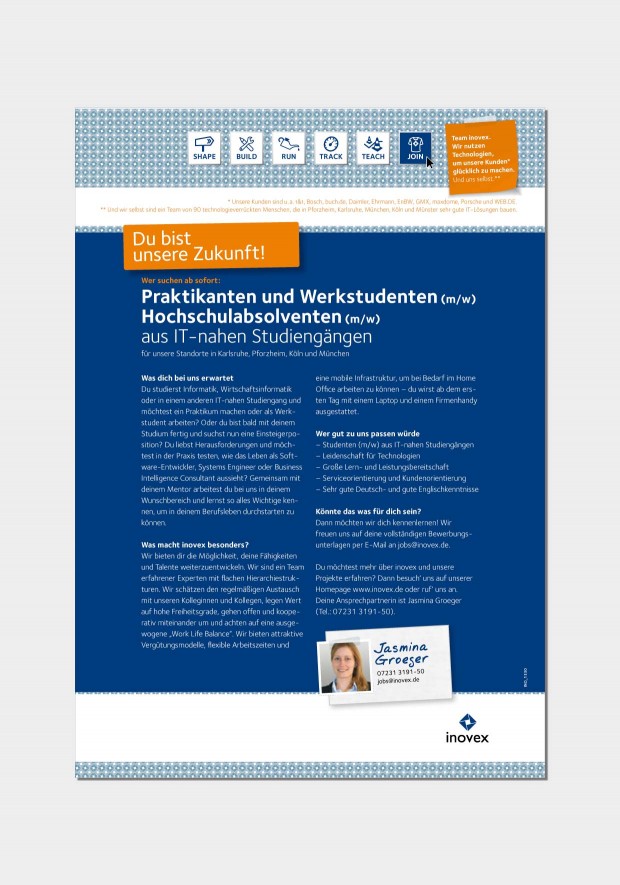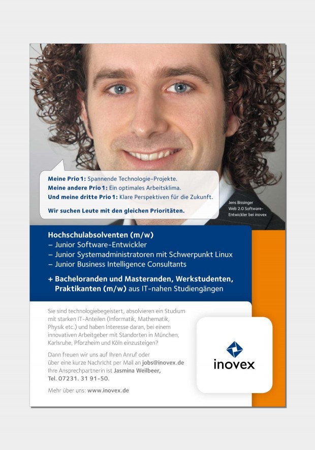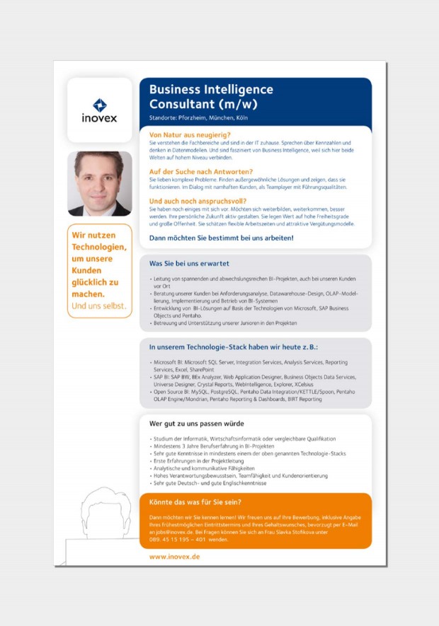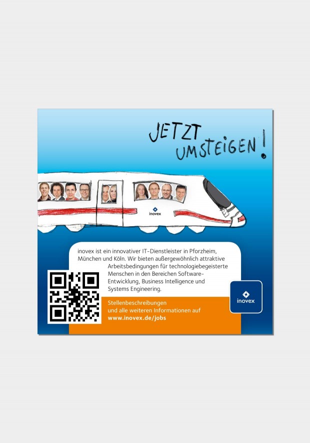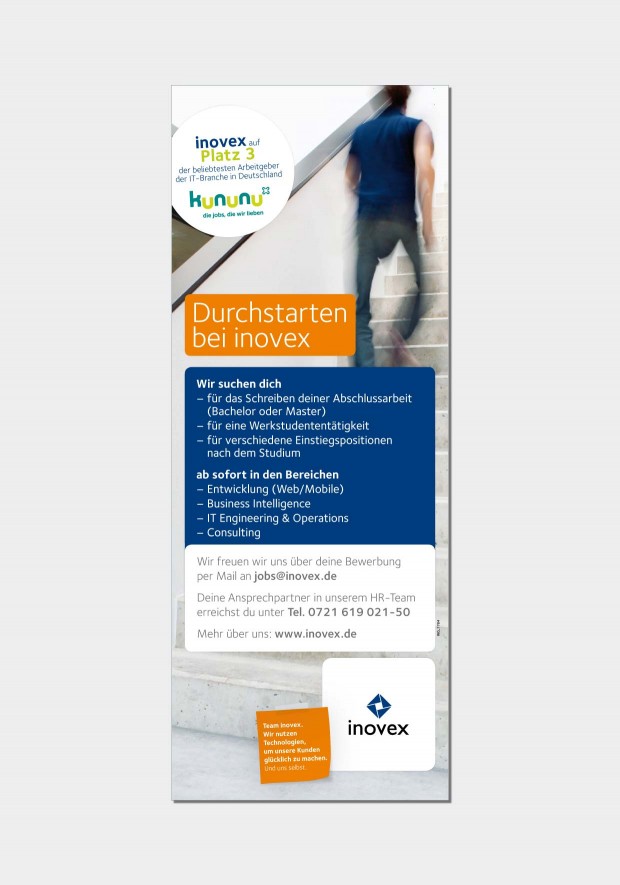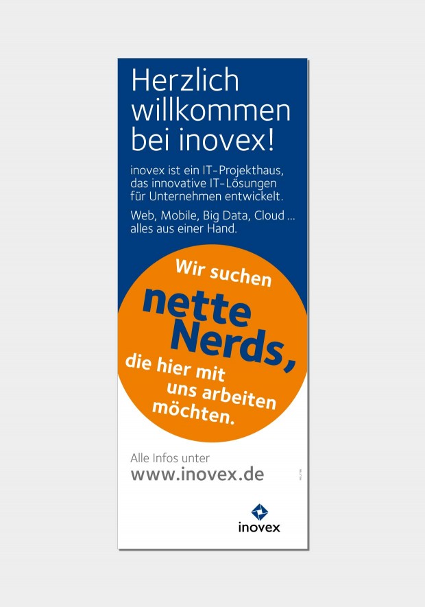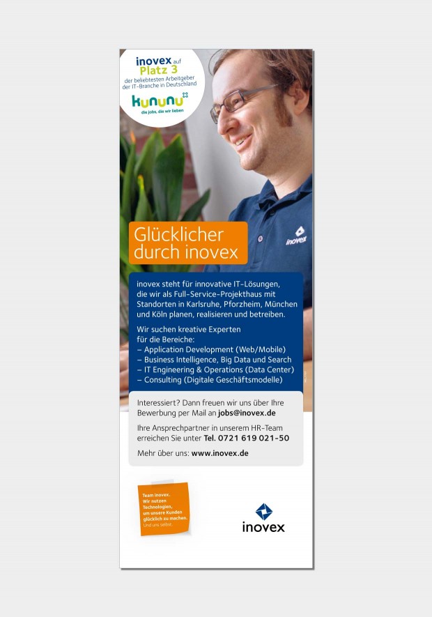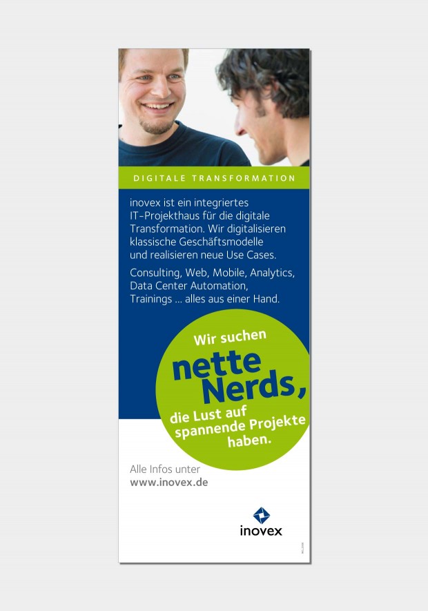 Wir unterstützen inovex seit 10 Jahren bei der Weiterentwicklung des Corporate Designs und erstellen Broschüren, Flyer, Anzeigen und allem was ein dynamisches Unternehmen wie inovex für die tägliche Kommunikationsarbeit benötigt.