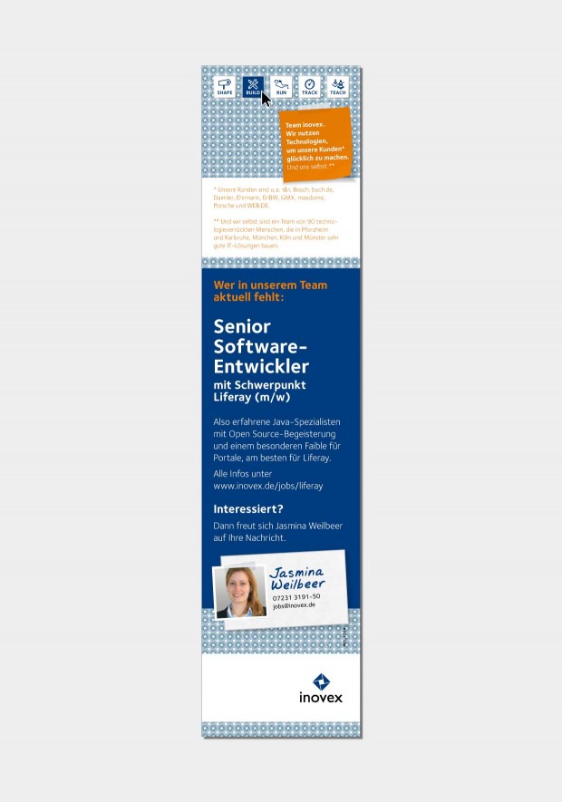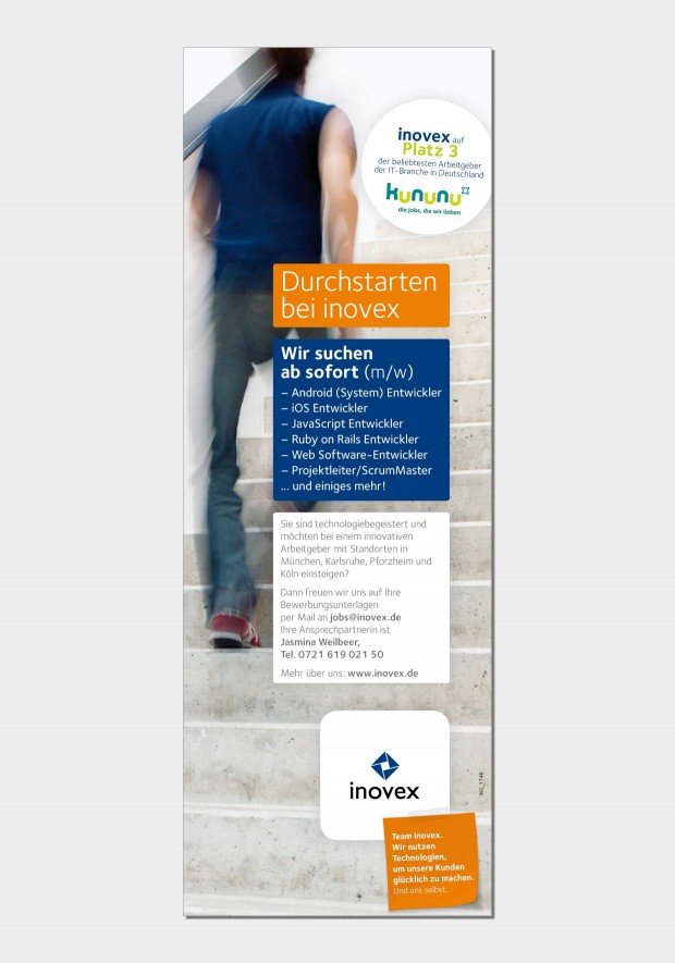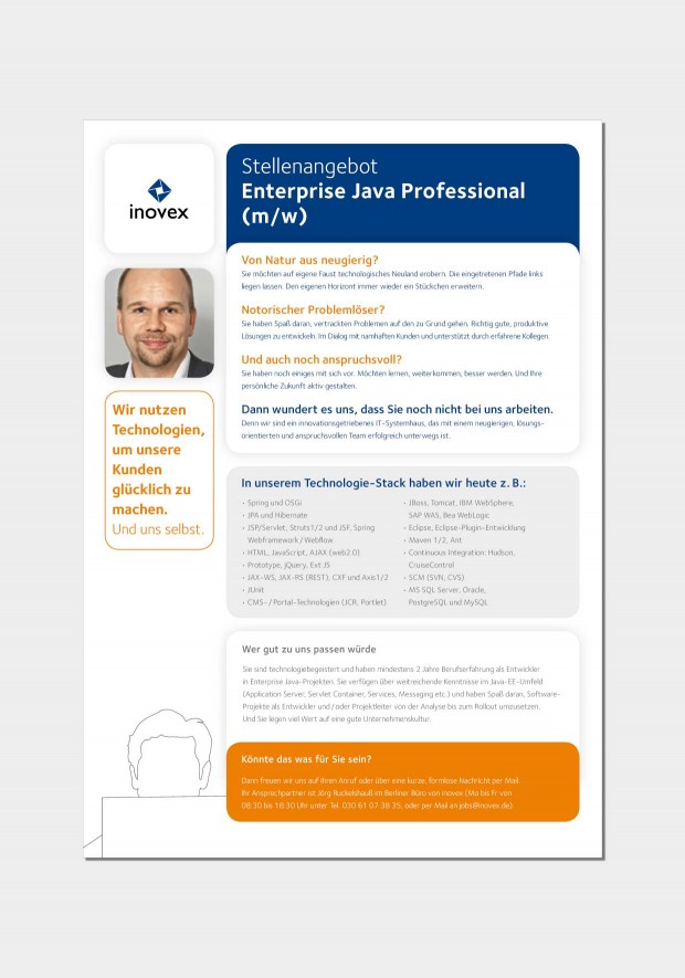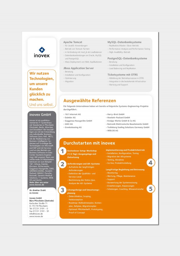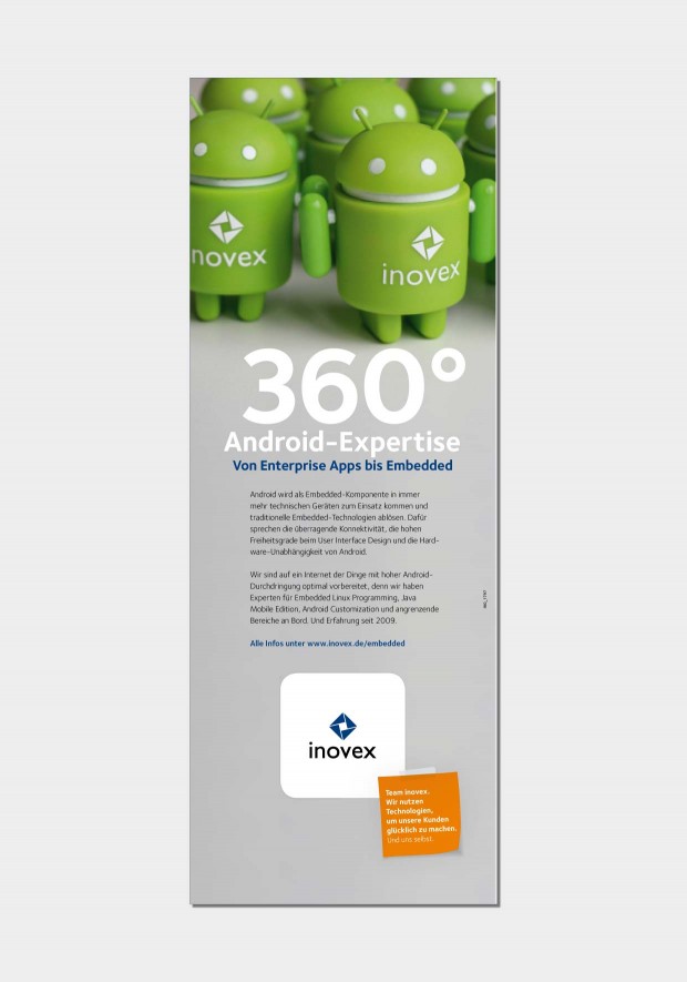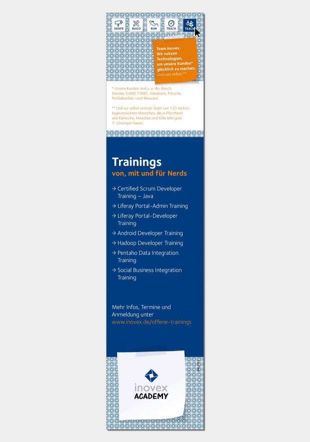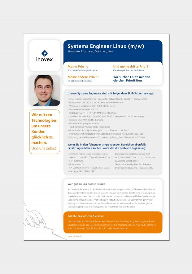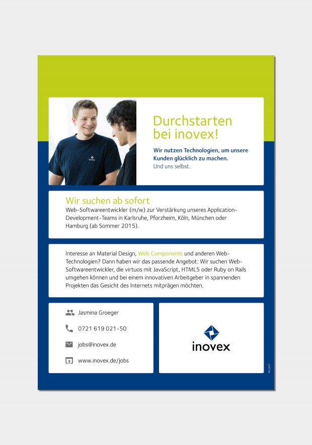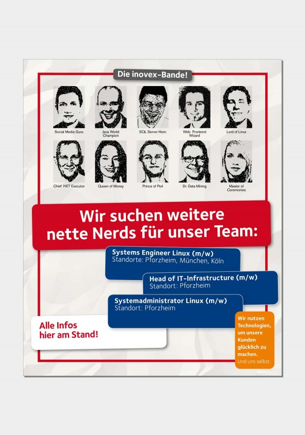 Wir unterstützen inovex seit 10 Jahren bei der Weiterentwicklung des Corporate Designs und erstellen Broschüren, Flyer, Anzeigen und allem was ein dynamisches Unternehmen wie inovex für die tägliche Kommunikationsarbeit benötigt.
