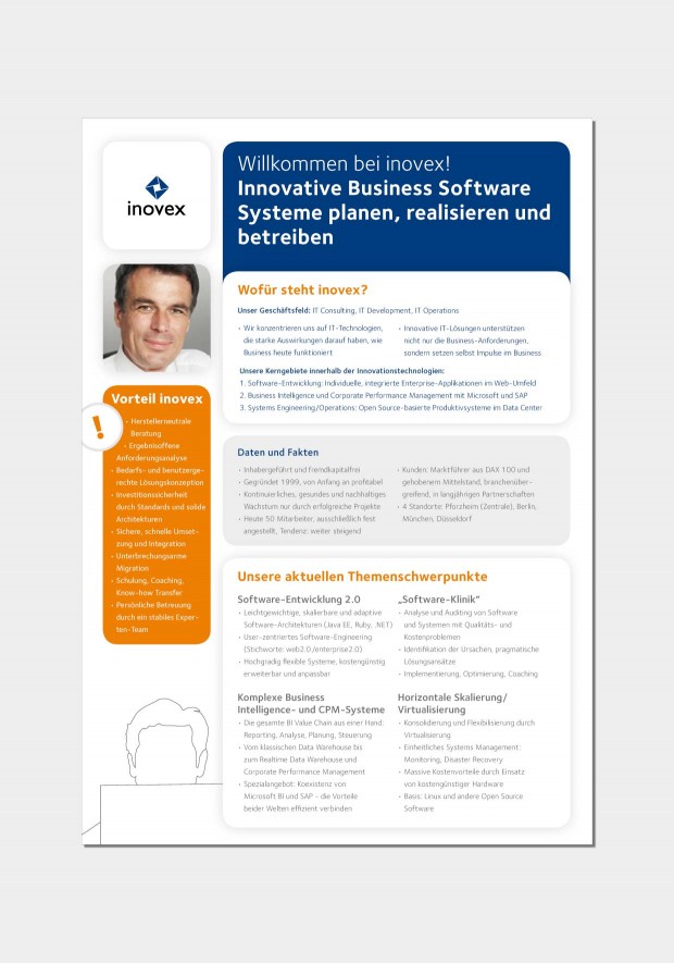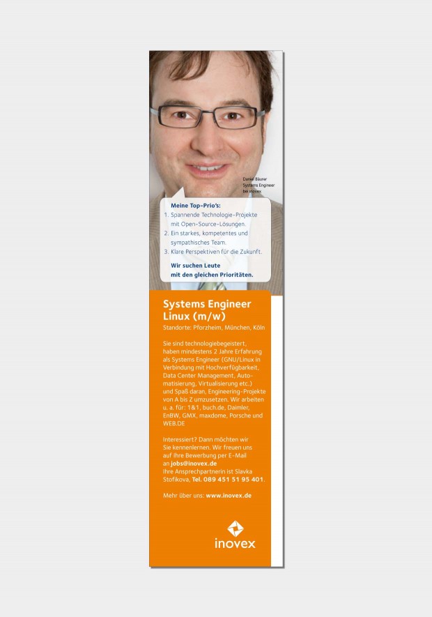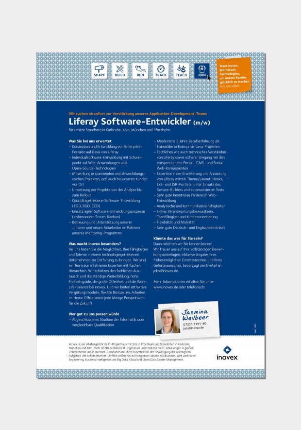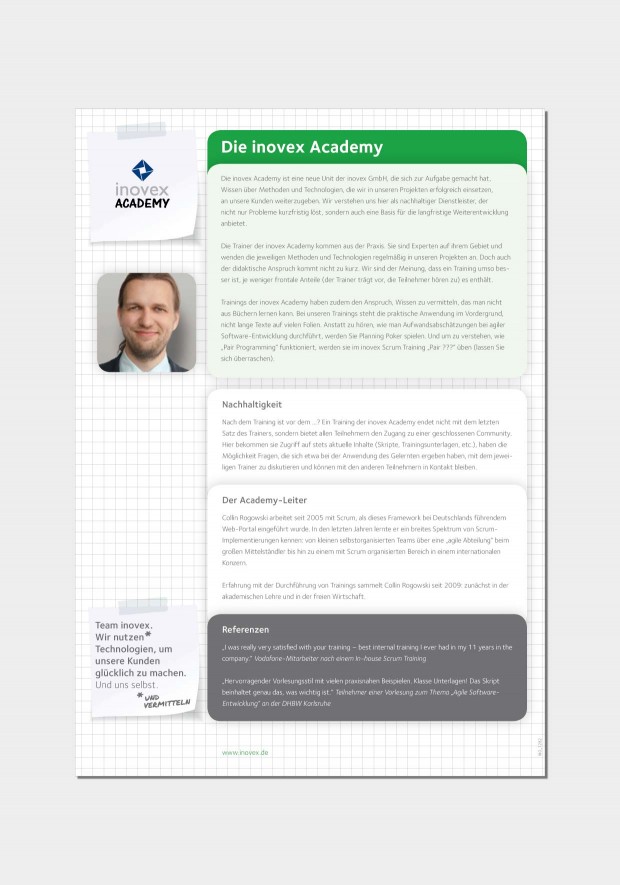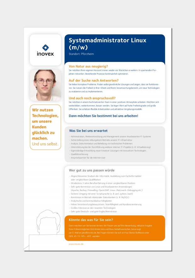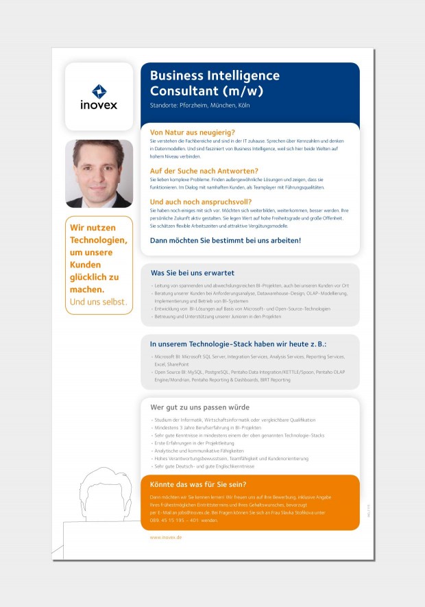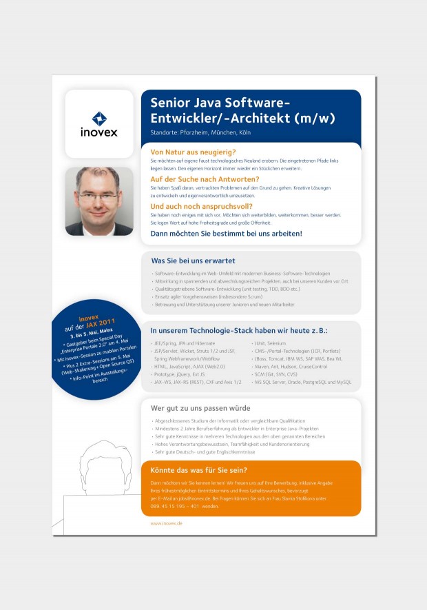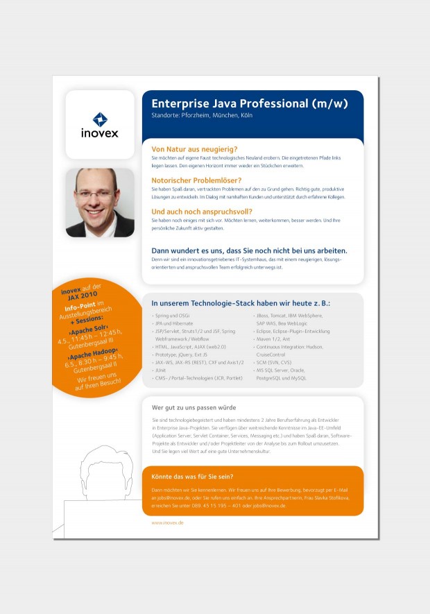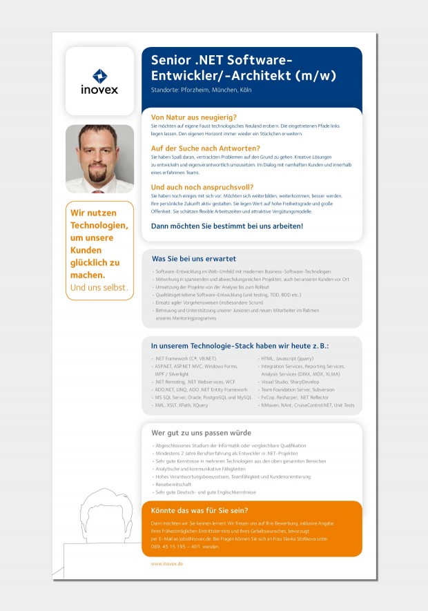 Wir unterstützen inovex seit 10 Jahren bei der Weiterentwicklung des Corporate Designs und erstellen Broschüren, Flyer, Anzeigen und allem was ein dynamisches Unternehmen wie inovex für die tägliche Kommunikationsarbeit benötigt.