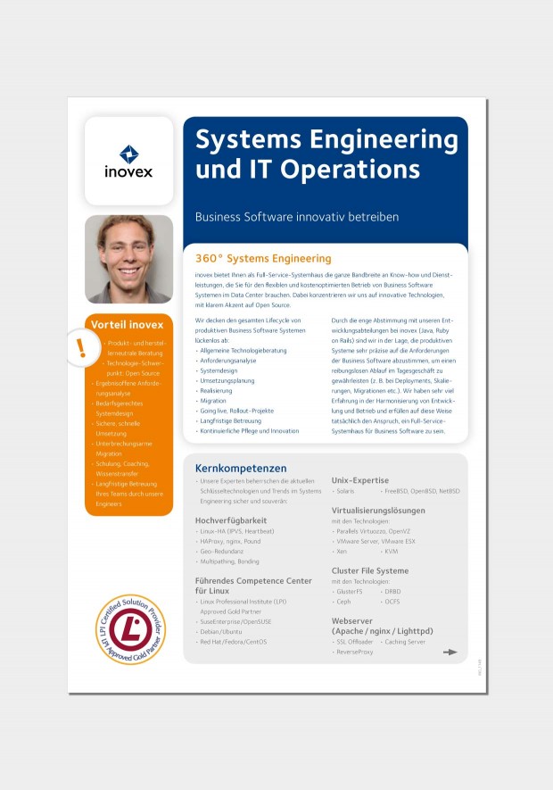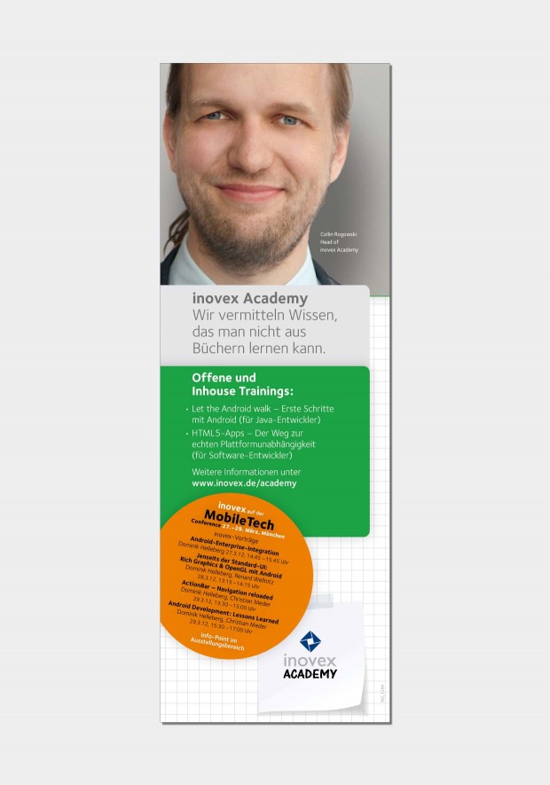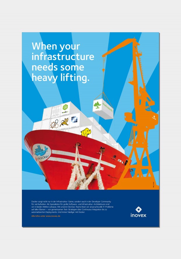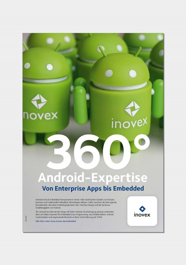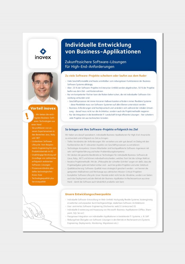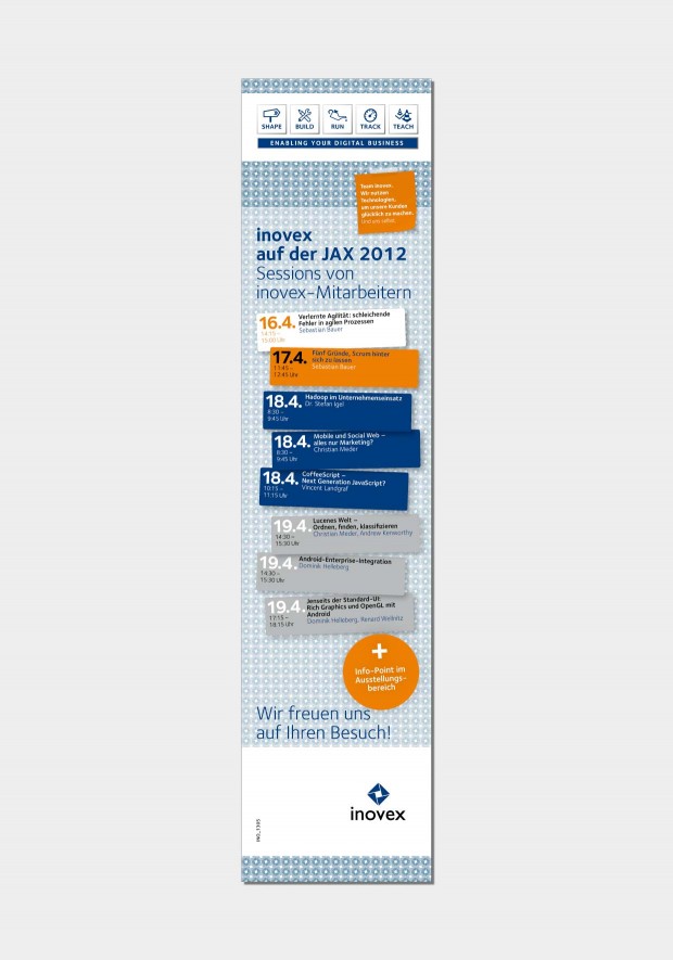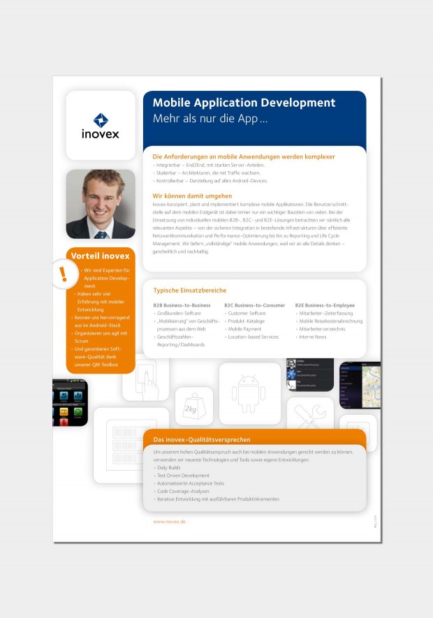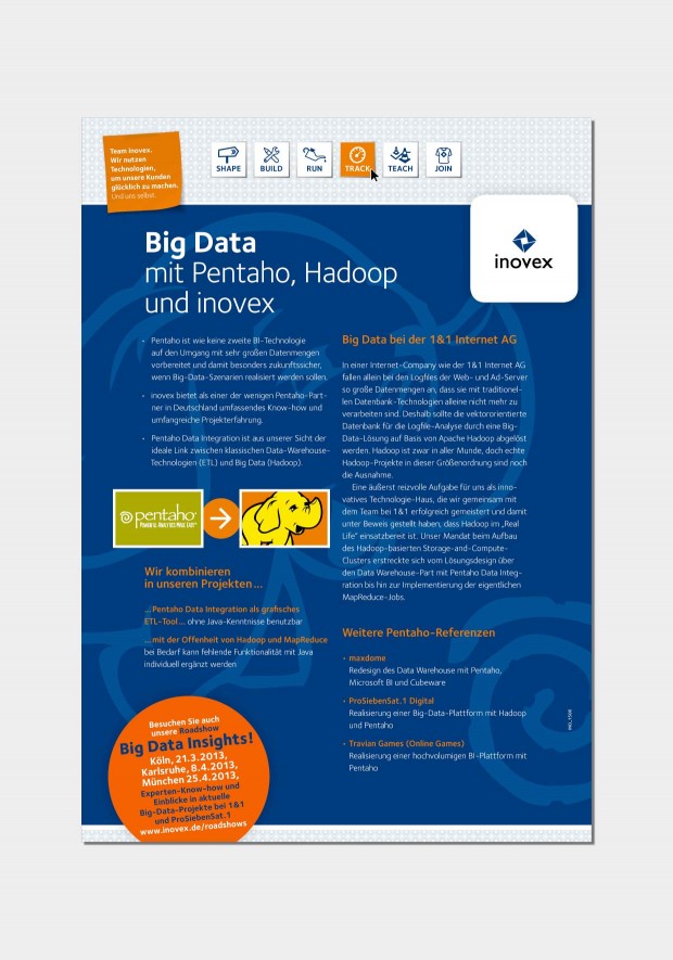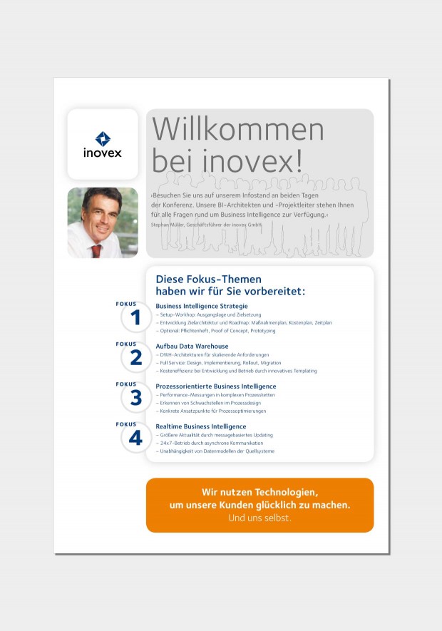 Wir unterstützen inovex seit 10 Jahren bei der Weiterentwicklung des Corporate Designs und erstellen Broschüren, Flyer, Anzeigen und allem was ein dynamisches Unternehmen wie inovex für die tägliche Kommunikationsarbeit benötigt.
